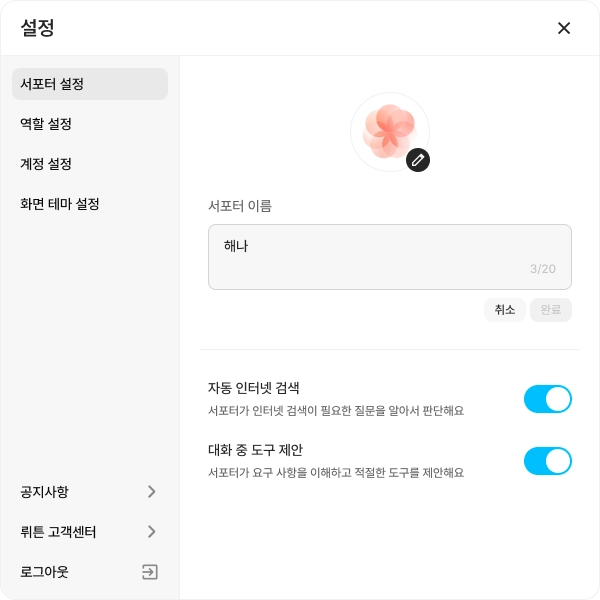 서포터가 대화할 때 사용하는 기능 등 뤼튼에서 이용할 수 있는 기능을 켜고, 끌 수 있어요.