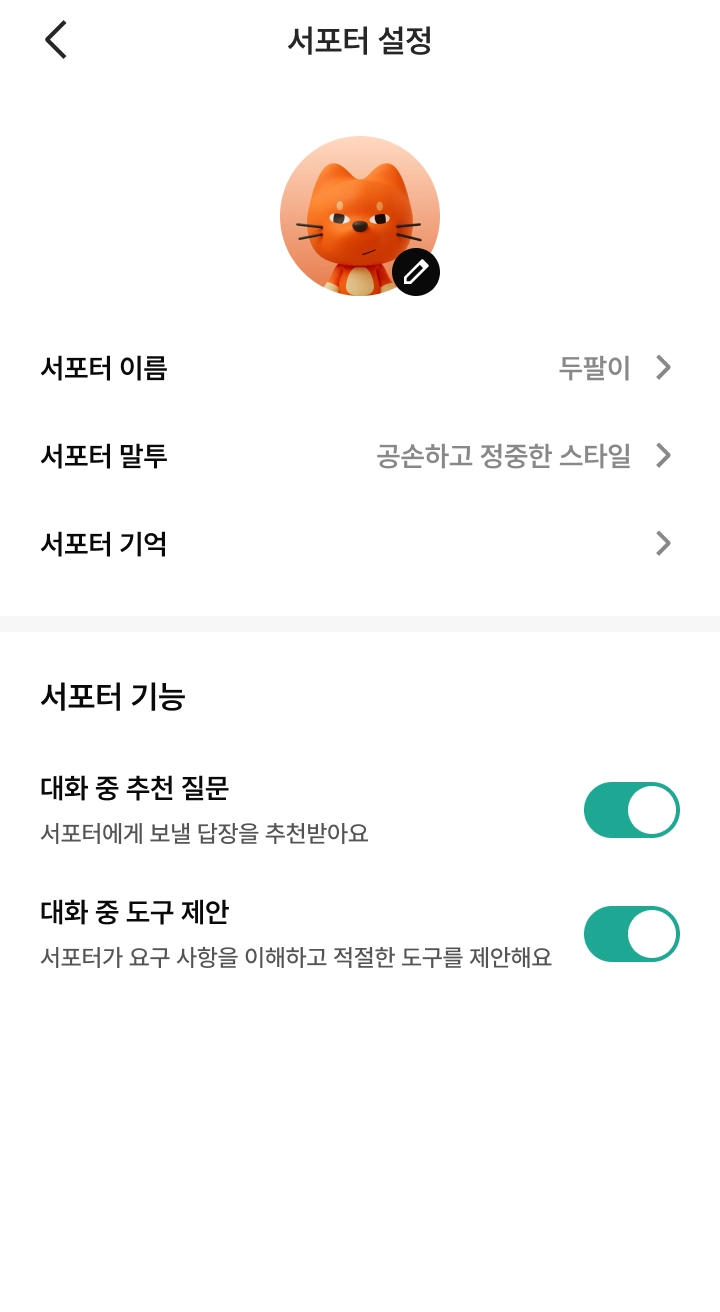 서포터의 이름과 말투를 자유롭게 설정하여, 나만의 개성 있는 서포터를 만들 수 있어요.