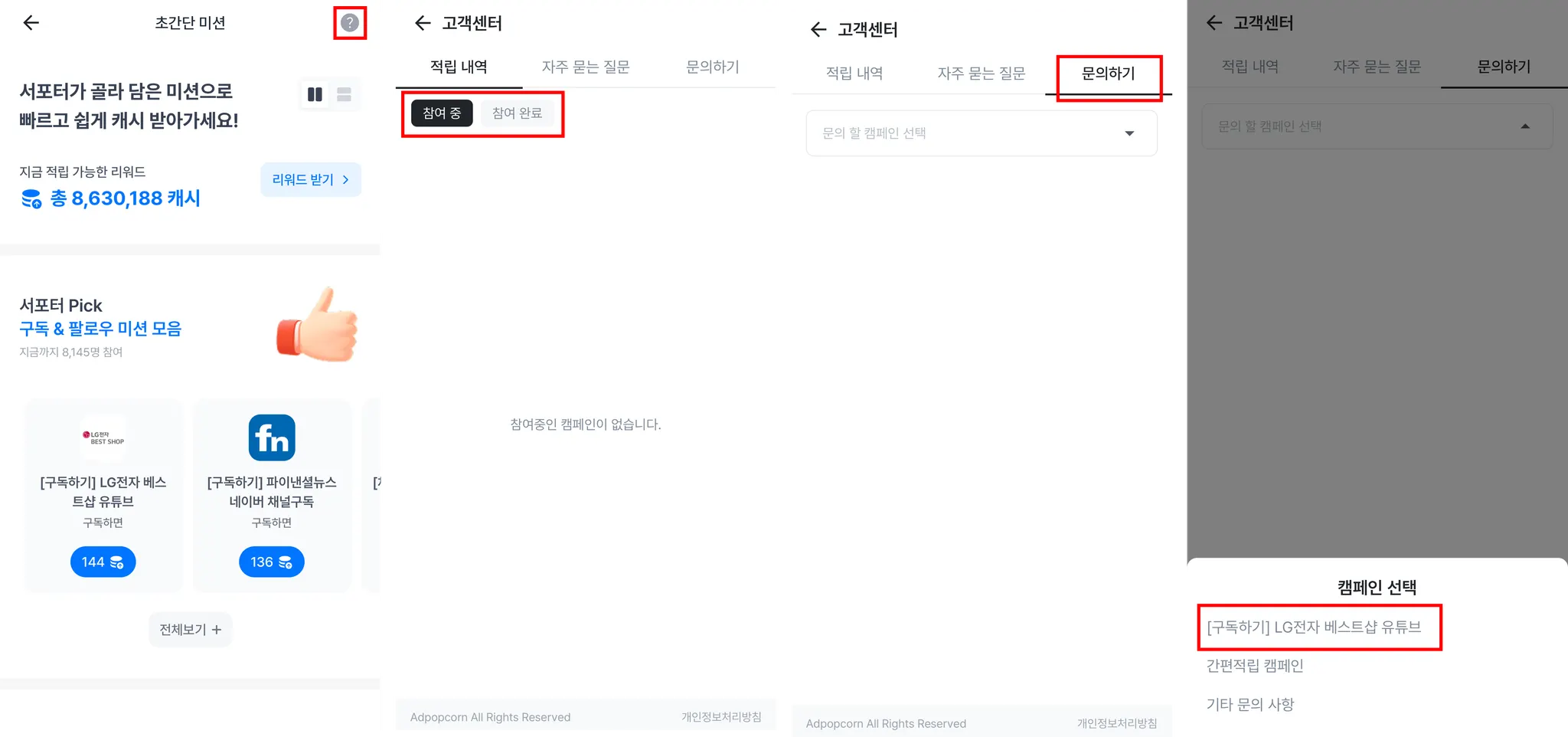 버튼을 클릭해 실제 참여가 진행되었는지 확인 후, 캐시가 지급되지 않은 미션을 클릭해 광고사에 문의해 주세요.