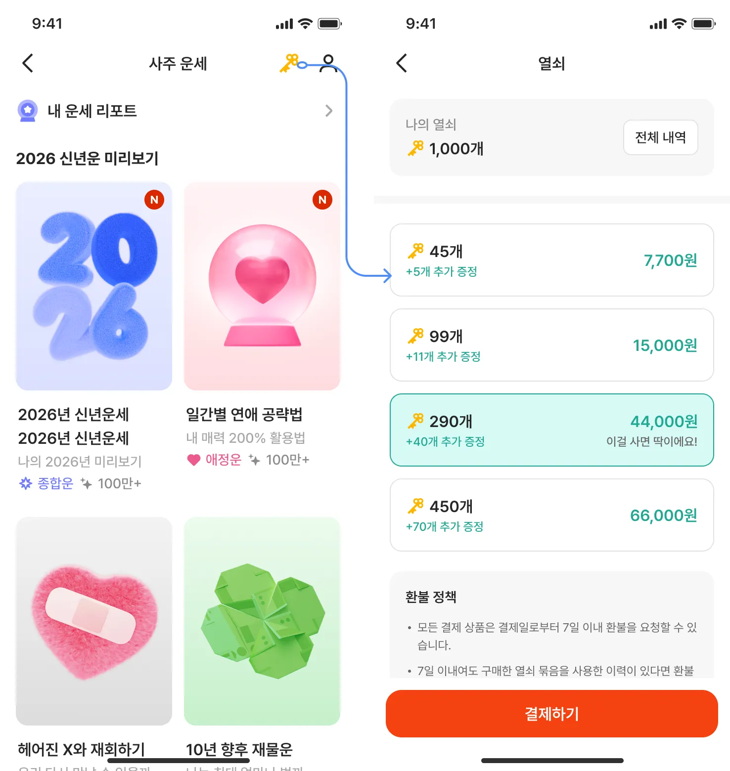 [2026 신년운세], [일간별 연애 공략법]은 현재 열쇠를 이용해 리포트를 만들 수 있어요.