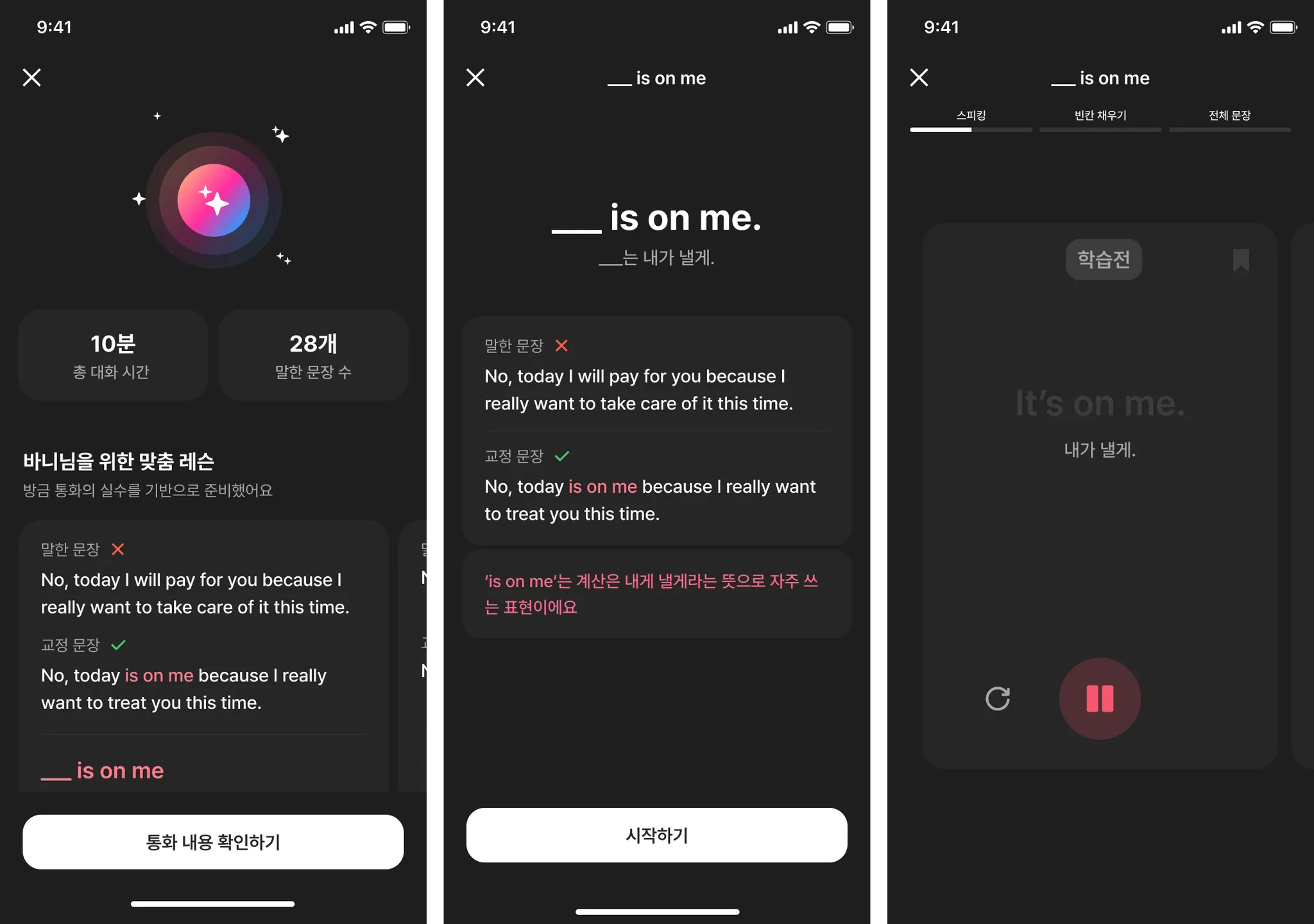 문장을 직접 말하고, 원어민 발음을 다시 들을 수 있어요.