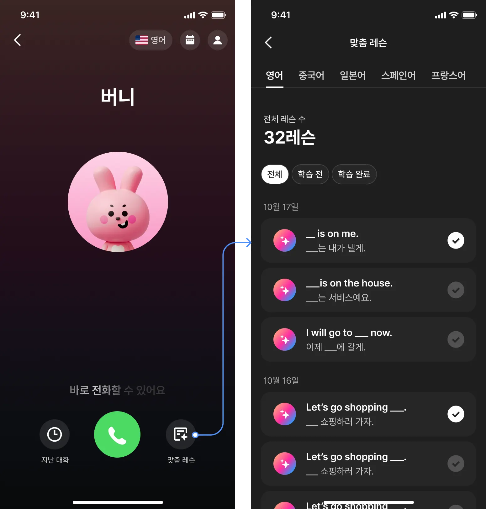 맞춤레슨은 학습 언어마다 분류되어 있고, 학습 전/학습 완료로 확인할 수 있어요.